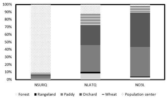 For each LULC, the nitrate export was categorized into three components of NSURQ, NLATQ, NO3L (Figure 9). The greatest percentage of nitrate export in orchards is related to leaching. In wheat crop, the highest percentage of export is related to the runoff flow, which can be due to rainfed cultivation of this crop, and rainfall will have less opportunity for leaching. However, in forests and rangelands, nitrate export is not significantly different from the three nitrate export components. In population centers, the largest share of nitrogen transfer is through washoff. Intensive fertilization during the farming season in agricultural land exports massive amounts of nitrate.
