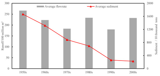 Predicting the response of natural or man-made channels to imposed supplies of flow and sediment is one of the most difficult practical problems faced by hydraulic engineers. The flow of the river moves the sediment and the channel bed is altered by erosion and the deposition of sediment. The shape of the river channel further modifies the flow. The interaction between flow and sediment is one of the primary dynamic factors in shaping riverbed channels. This complex interaction has been a continuous interest for river researchers and engineers. It plays an important role in determining erosion and deposition characteristics in natural river channels [1]. Much work has been conducted globally in the past to study the interaction between vegetation, flow and sediment [2,3,4], over grassed areas [5], and through numerical simulations [6,7]. However, few studies can be found which investigate the interaction of flow and sediment in China. A research gap was noted. In recent years, significant changes have been noted in flow and sediment interaction due to the combined effects of climate change and human activities. Some changes are noted along the middle reach of Yangtze River and the estuary of the Yellow River. The riverine ecosystems have been affected by the changes in the flow and sediment relationship. Additionally, as a major river in China, the Huai River is also notoriously vulnerable to flooding. The interaction between flow and sediment along the Huai River has been significantly changed. A significant reduction in sediment has been noted in the middle reach of the Huai River [8]. The main reasons for the reduction in sediment include: the construction of hydraulics structures, such as dams and sluices; soil conservation practice; and high-intensity sand mining. As shown in Figure 1, the average annual sediment runoff in the mainstream station of Lutaizi has decreased from 18 million tons in the 1950s to 3 million tons in 2000. However, the flow rate has remained relatively constant over the years. The decrease in sediment can have a significant impact to river channel development in the Huai River, which has received wide attention. Yu and Yu et al. [9,10,11] analyzed the erosion and deposition characteristics of the mainstream channel based on field data. It was noted that the deposition from Wangjiaba to Lutaizi was reduced, while from Lutaizi to Bengbu, the sediment movement changed from deposition to erosion. Between Bengbu and Fushan, further erosion was noted. Liu and Yang et al. [12,13], used topographic data of river cross-sections in the mainstream of the Huai River gathered over the past 70 years. It was found that the river channel erosion had been significantly increased due to sediment mining activities, which caused an uneven channel cutting in many sections of the Huai River. Moreover, with a deep cut and steep slope, river banks have a high potential of collapse, which poses a significant threat to flood control, navigation and shoreline utilizations. The behavior of sediment transport could potentially increase the flooding risk and pose a significant threat to public safety [14]. From the 1990s onwards, flood disasters in the Huai River have shown an increasing trend [15]. Investigation into the flow and water interaction in the Huai River is thus urgently needed.