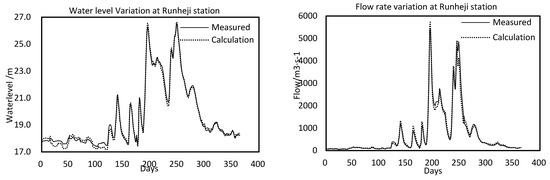 The comparison between the field data and simulation can be found in Table 2. It should be noted that for both calibration and validation, the difference between the field data and simulation is below 15%, with the exception of 2001. The 2005 data are used in Figure 3 to demonstrate the simulation results. A good agreement was reached between the simulation and field data regarding both water level and flow rate. The present model was then applied to the Wanglin section for erosion and deposition simulation.