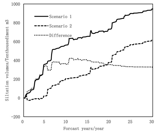 The sediment deposition under the simulated scenarios was numerically simulated. From the simulation, it was found that the deposition at the Wanglin station could be significantly reduced at Scenario 2, as shown in Figure 4. At the end of 10 years, the sediment deposition under Scenario 2 was 2.01 million m3, which is 63.7% less compared to that of Scenario 1. At the end of the 30-year calculation period, the sediment deposited at the Wanglin station was calculated to be 6.19 million m3 under Scenario 2, which is 34.6% less compared to that of Scenario 1. The main difference between the two scenarios is in the first 15 years. Due to the increased incoming sediment from 1987 to 1991, the sediment concentration was accumulated rapidly in Scenario 1. The largest difference was regarding the value at the end of 12 years, with an amount of 4.23 million m3.
