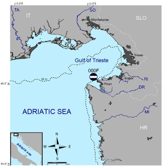 The Slovenian LTER station (45.53833° N, 13.55° E; 21 m depth) is located at the southern entrance to the GoT (Figure 1), where direct impact from freshwater inputs and other pressures are minimal. The waters around the station are usually traversed by the current North Adriatic Dense Water (NAdDW). Only occasionally, they are reached by the plume of the Soča (Isonzo) River (SO, Figure 1), one of the local freshwater sources that has the greatest influence on the basin []. The Slovenian LTER station represents the reference station for national monitoring purposes, but the bias of the representation should be taken into account when generalizing the results to the whole Gulf.
