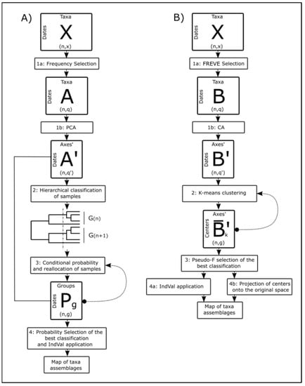 Data analysis was performed using R-studio software (Version 1.1.456—© 2021–2018 RStudio, Inc., Boston, MA, USA). Table A1 in Appendix A shows the list of packages used in the analysis. Prior to analysis, data from different depths were merged in the Integrated Abundance (IA) using the trapezoidal rule. On the resulting matrix of taxa IAs (matrix X; Figure 2), a series of statistical methods for clustering the samples proposed by Anneville et al. [] were applied (Figure 2A) and then modified (Figure 2B). The core idea was to create a clustering system of the samples based on the distribution of taxa and then obtain the indicative taxa for each cluster by the index of Fidelity and Specificity (IndVal) [].