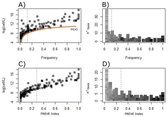 The rationale for the selection of taxa: (A) Frequency vs. log cumulative abundance distribution of taxa (points), dashed line represents the 12% threshold; (B) Frequency histogram of taxa, dashed line represents the 12% threshold, grey scale represents relative abundance of taxa; (C) FREVE index vs. log cumulative abundance distribution of taxa (points), dashed line represents the value of 0.28; (D) Histogram of FREVE index, the dashed line represents the 0.28 value of fluctuation index, grey scale represents the relative abundance of taxa.