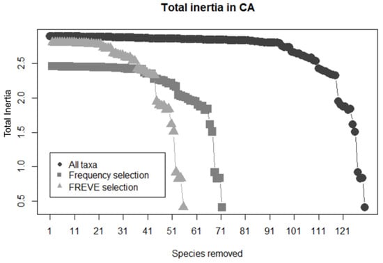 A comparison between selection methods was made using Inertia Analysis. Total Inertia (TI) was calculated as the sum of the eigenvalues of the χ2 dissimilarity matrix. Taxa were sequentially removed from less abundant to abundant and TI was recalculated (Figure 4). The initial TI’s value of the complete dataset (2.89) is closer to the TI value for the dataset obtained by FREVE selection (2.81) than the TI values obtained by frequency selection (2.46). This means that FREVE retains more information from the original dataset. The one species rescued by FREVE (Table 1) was responsible for about 13% of the data TI, more than the 17 discarded taxa.