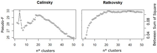 (left) Calinski Pseudo-F results plotted for each n-clustered possible partition and (right) the Ratkowsky index for each n-clustered possible partition.