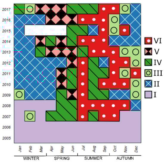 Late winter and early spring were mostly defined by the remnants of the largest cluster in the 4-clustered partition, namely Cluster IX, which in this case consisted of only one indicative species (Meringosphaera mediterranea). The taxa with a higher-than-expected abundance (data not shown in Table 4) were similar to those of Cluster I in the 4-clustered partition, which means that Cluster IX can be interpreted as a mixed community with the dominance of nanoflagellates, which have a known spring peak in the GoT []. The fact that this cluster was less present in 2011 and 2012 than in other years seems to agree with the results of Cerino et al., 2019 [], who described a low nanoflagellate density at the Italian LTER station in those two years.