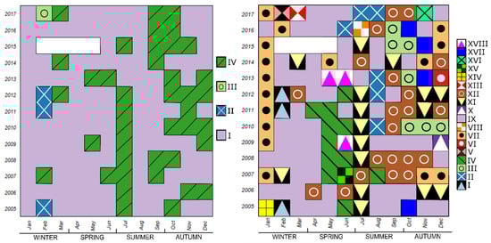 The temporal map of 18 clusters obtained with the modified protocol is shown in Figure 7 (right), with the corresponding Xproj and IndVal values summarized in Table 4. It shows a more complex picture of seasonality, especially in autumn. Ten clusters included three or more samples/months, while the remaining eight included only one sample/month.