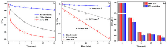 The removal ratio of DCF (a), DCF degradation kinetics (b), and PM consumption (c) by the PM, MFC-E, and MFC-PM processes (pH = 3.0; [DCF]0 = 60 µM; external resistance = 0 Ω; [PM]0 = 30 µM).