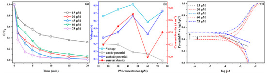 The DCF removal ratio (a), the change of voltage, cathode/anode potential, and current density (b), and Tafel curve (c) in different PM concentrations (pH = 3.0; [DCF]0 = 60 µM; external resistances = 0 Ω).