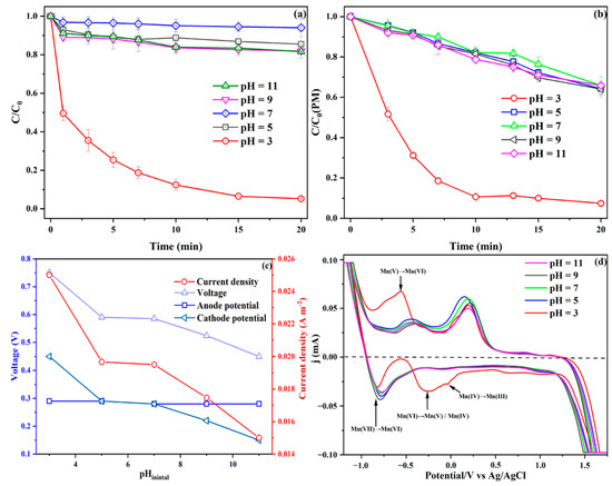 DCF removal (a), PM consumption (b), voltage, cathode/anode potential and current density (c), and cyclic voltammetry curve (d) at different pH values ([PM]0 = 30 µM; [DCF]0 = 60 µM; external resistance = 0 Ω).