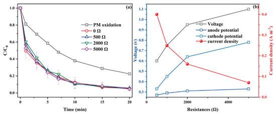 DCF removal (a), and voltage, cathode/anode potential and current density (b) at different values of external resistance ([PM]0 = 30 µM; [DCF]0 = 60 µM; pH = 3.0).