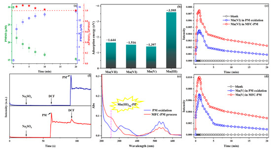 PMSO degradation and PMSO2 formation in the MFC-PM process (a), adsorption energies of different RMnS on Pt(111) lattice plane (b), Mn(V)aq (c) and Mn(VI)aq levels in the various processes (d), UV-vis spectra of Mn(III)aq-PP in the PM and MFC-PM processes after 20 min (e), and chronoamperometry in 0.05 M Na2SO4 electrolyte (f).