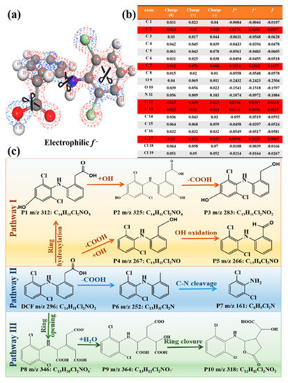HPLC/MS analysis and DFT calculation were employed to elucidate the degradation pathway of DCF in the MFC-PM process. At first, the Fukui index, representing electrophilic attack (f-) and the natural population analysis charge distribution were calculated to predict the location of DCF that RMnS might attack. As displayed in Figure 6a,b, C2, C7, C12, C13, and C17 possessed relative larger f- values, which meant that these locations were more vulnerable to RMnS attack in theory [46]. Furthermore, combined with the HPLC/MS results and DFT calculation, a possible degradation pathway was proposed. As shown in Figure 6c, first, DCF degradation was classified into three routes: ring opening, ring hydroxylation, and decarboxylation. In the ring opening pathway, the C2 atom was attacked, leading to the generation of P8 (m/z 346), and then P8 (m/z 346) was converted to P10 (m/z 318) by hydrolysis and ring closure. In the ring hydroxylation pathway, the C7 atom with the highest f- (0.1962) was attacked to form P1 (m/z 312) and P4 (m/z 267), and P1 and P4 were converted to P3 (m/z 283) and P5 (m/z 266), respectively, by a multi-step decarboxylation and oxidation; DCF underwent decarboxylation and C-N cleavage to eventually form P7 (m/z 161). Finally, the intermediates could be further attacked by reactive species to cleave into smaller molecules (e.g., CO2 and H2O).