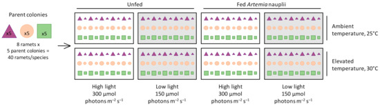 were fragmented into eight large and eight small ramets and distributed randomly and evenly among eight treatments of a fully factorial experimental design: two seawater temperatures (ambient temperature of 25 °C, elevated temperature of 30 °C), two light levels (high light of 300 μmol photons m−2 s−1, low light of 150 μmol photons m−2 s−1), and either fed (Artemia nauplii) or unfed.