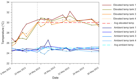 Temperature (°C) in each of the eight tanks over the duration of the study. The temperature ramp ended on 13 May 2013 as indicated by the vertical dashed gray line. Average temperature of the four ambient temperature tanks was 25 °C ± 0.5 (1SD), while average temperature for the elevated temperature tanks was 30 °C ± 0.6 (1SD). Average temperatures were calculated from the end of the ramping period on 13 May 2013 until the end of the experiment on 30 May 2013.