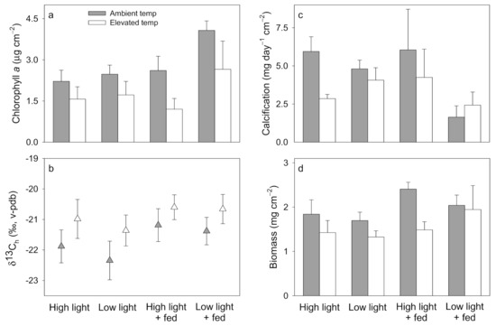 Pocillopora damicornis average (±1 SE) (a) chlorophyll a, (b) δ13Ch, (c) calcification, and (d) biomass, under ambient temperature (25 °C, solid bars and symbols) or elevated temperature (30 °C, open bars and symbols) within high light (300 μmol photons m−2 s−1, unfed), low light (150 μmol photons m−2 s−1, unfed), high light + fed (300 μmol photons m−2 s−1, fed), and low light + fed (150 μmol photons m−2 s−1, fed) treatments. N = 3–4 for all averages. Significant effects from corresponding ANOVAs indicated in Table S3.