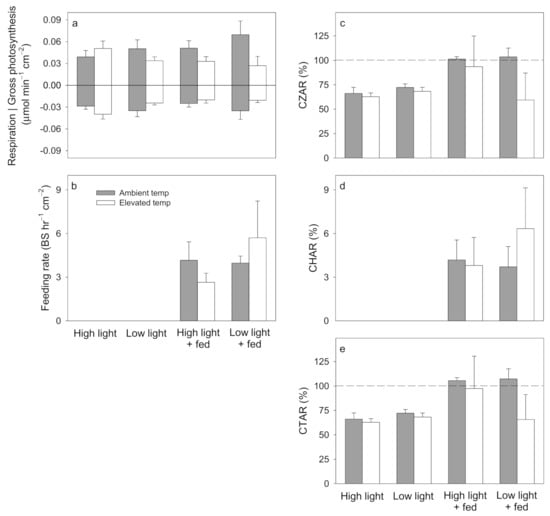 Pocillopora damicornis average (±1 SE) (a) photosynthesis and respiration, (b) feeding rate, (c) Contribution of Zooxanthellae (Symbiodiniaceae) to Animal Respiration (CZAR), (d) Contribution of Heterotrophy to Animal Respiration (CHAR) from feeding on Artemia nauplii, and (e) Contribution of Total acquired fixed carbon relative to Animal Respiration (CTAR = CZAR + CHAR), under ambient temperature (25 °C, solid bars) and elevated temperature (30 °C, open bars) within high light (300 μmol photons m−2 s−1, unfed), low light (150 μmol photons m−2 s−1, unfed), high light + fed (300 μmol photons m−2 s−1, fed), and low light + fed (150 μmol photons m−2 s−1, fed) treatments. N = 3 for all averages. Significant effects from corresponding ANOVAs in Table S4.