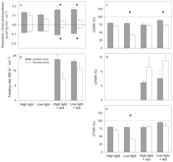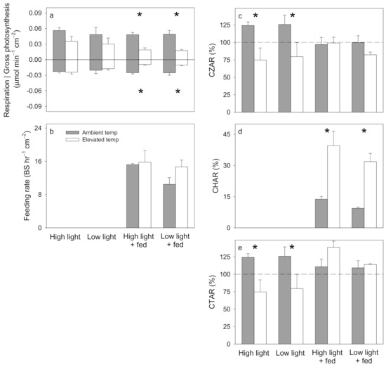 Stylophora pistillata average (±1 SE) (a) photosynthesis and respiration, (b) feeding rate, (c) Contribution of Zooxanthellae (Symbiodiniaceae) to Animal Respiration (CZAR), (d) Contribution of Heterotrophy to Animal Respiration (CHAR) from feeding on Artemia nauplii, and (e) Contribution of Total acquired fixed carbon relative to Animal Respiration (CTAR), under ambient temperature (25 °C, solid bars) and elevated temperature (30 °C, open bars) within high light (300 μmol photons m−2 s−1, unfed), low light (150 μmol photons m−2 s−1, unfed), high light + fed (300 μmol photons m−2 s−1, fed), and low light + fed (150 μmol photons m−2 s−1, fed) treatments. Asterisks indicate significant differences between ambient and elevated temperature treatments within each light and feeding treatment combination. N = 3 for all averages. Significant effects from the corresponding ANOVAs in Table S7.