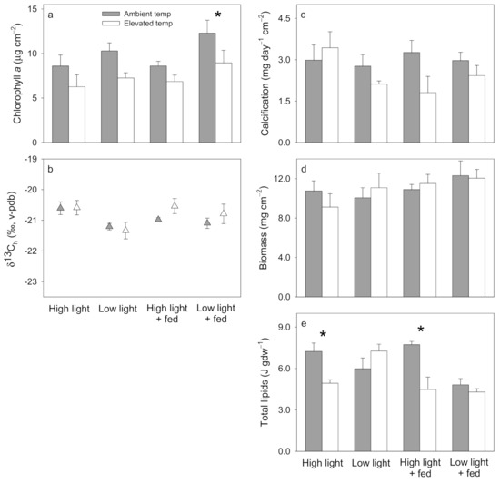 Stylophora pistillata average (±1 SE) (a) chlorophyll a, (b) δ13Ch, (c) calcification, (d) biomass, and (e) total lipids, under ambient temperature (25 °C, solid bars) and elevated temperature (30 °C, open bars) within high light (300 μmol photons m−2 s−1, unfed), low light (150 μmol photons m−2 s−1, unfed), high light + fed (300 μmol photons m−2 s−1, fed), and low light + fed (150 μmol photons m−2 s−1, fed) treatments. Asterisks indicate significant differences between ambient and elevated temperature treatments within each light and feeding treatment combination. N = 5 for all averages. Significant effects from corresponding ANOVAs in Table S6.