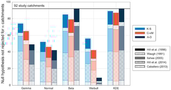 The first objective was to evaluate the functional form of initial losses for a wide range of catchments throughout Australia. For this purpose, a bootstrap-based goodness-of-fit procedure was employed, as explained in Section 2, using previously calibrated initial loss data sets, according to Section 4.1. The null hypothesis was evaluated for all 92 catchments and five probability distributions, using three goodness-of-fit tests at a significance level 10%. It should be noted that 5% or 1% significance levels can also be adopted; however, use of 10% level is commonly accepted in statistical hydrology [,]. The quality of the goodness-of-fit test statistics is dependent on the unknown underlying distribution, on the distribution parameters and on the sample size. Although these tests can be quite powerful in some situations, they may produce erroneous statistics in others. With this in mind, here we will highlight some of the more interesting findings that can be drawn from the bootstrap procedure.