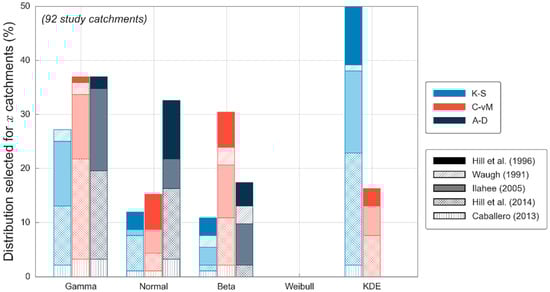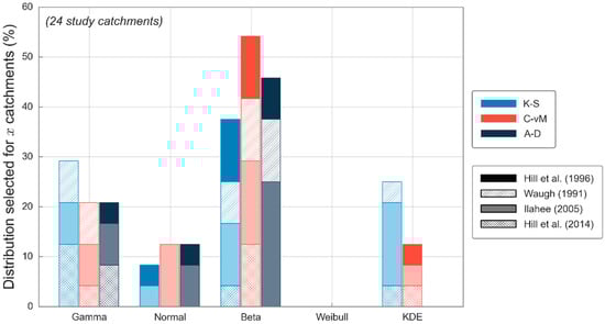 Following on from this, the percentage of cases for which each candidate distribution is selected as the most representative distribution (see Section 2.2) for each goodness-of-fit test is reported for each study (see Figure 3). Here it can be seen that three candidate distributions (Gamma, Normal and Beta) were selected for a rather large percentage of catchments across all three goodness-of-fit tests, which demonstrates their potential suitability for representing the underlying initial loss distribution. The KDE distribution; however, returned mixed results across the three goodness-of-fit tests, with the distribution not being selected at all using the A-D test, but then being selected for 50% of catchments using the K-S test.