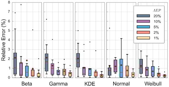 Distribution of relative errors in design flood estimates for each quantile across the eight study catchments using five candidate distributions to represent variability in initial losses. Here KDE (kernel density estimate) represents nonparametric method and AEP stands for annual exceedance probability.