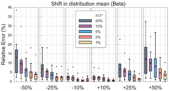 Distribution of relative errors in design flood estimates for each flood quantile across the eight study catchments using distributions with the means shifted by specified percentages (Beta distribution).