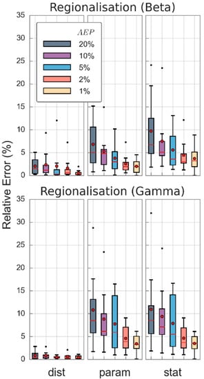 Distribution of relative errors in design flood estimates for each flood quantile across the eight study catchments using various methods to regionalize probability-distributed initial losses (parametric models). (Here, Beta and Gamma distributions are used to regionalize initial loss distribution).