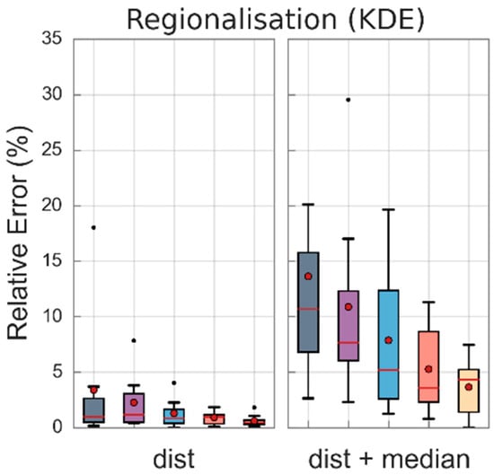 - Regionalization of the probability distribution and median value (dist + median): a standardized KDE distribution is assumed to be the true underlying distribution and the median value is estimated from within a hydrologically similar region.