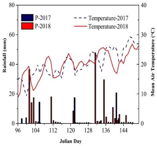 The experiment was conducted at the experimental station of the Farmland Irrigation Research Institute, Chinese Academy of Agricultural Science (35°08′ N, 113°45′ E, elevation 81 m), located in Qiliying town, Xinxiang City, Henan Province in the NCP. The experimental fields are irrigated with groundwater. The seedbed was prepared by a tractor-drawn rotary cultivator up to a depth of 20 cm to form a smoothed seedbed. Nitrogen (N): 120 kg ha−1 (ammonium nitrate), phosphorous (P2O5): 90 kg ha−1 (calcium super-phosphate), and potassium (KO2): 30 kg ha−1 (potassium sulphate) was applied as a basal dose of fertilizer in all treatments [25]. N as urea (CO (NH2)2) also was manually broadcasted at 300 kg ha−1 in all treatments on Julian days 98 and 104 in 2017 and 2018, respectively. On 16 October 2016, and 22 October 2017, the winter wheat cultivar “Zhoumai 22” was sown at 180 kg ha−1 (20 cm row spacing), using a tractor-drawn seed drill. A randomly selected 1 m2 of plant sample was manually harvested on May 31 in 2017 and 2018 for all experimental plots. The grain was winnowed, solar-dried to a 12% moisture content [25], and weighed using a precise digital balance (Ohaus, AX224 Adventurer, Parsippany, NJ, USA). Weather data were collected from an automatic weather station installed near the experimental fields.