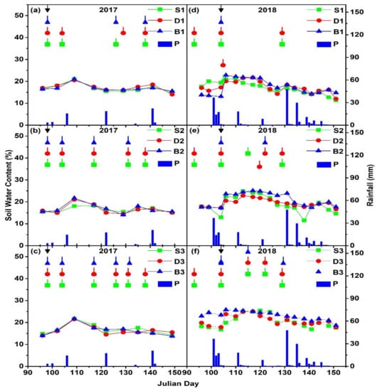 Soil water content (SWC) in (a) 50% FC, (b) 60% FC, and (c) 70% FC irrigation scheduling during 2016–2017 and in (d) 50% FC, (e) 60% FC, and (f) 70% FC irrigation scheduling in the top 0–20 cm during 2017–2018 growing season in all treatments. Note: S1, S2, and S3 represents sprinkler irrigation at 50%, 60%, and 70% FC, respectively. D1, D2, and D3 represent drip irrigation at 50%, 60%, and 70% FC, respectively. B1, B2, and B3 represent border irrigation at 50%, 60%, and 70% FC, respectively. Error bars represent standard errors of three replicates. P represents rainfall. Error bars represent standard errors of three replicates. Square, circular, and triangular arrows denote irrigation dates of sprinkler, drip, and border irrigation, respectively. The solid arrow indicates the day of fertilization.