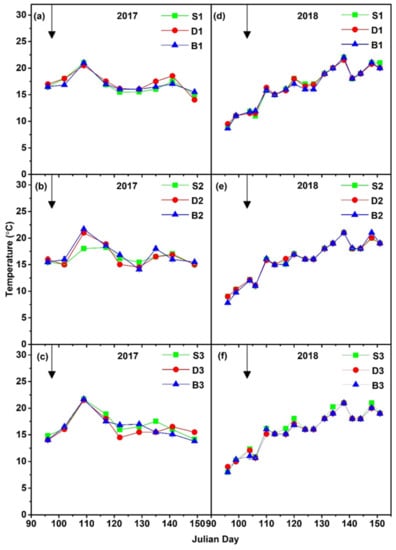 Soil temperature (°C) in (a) 50% FC, (b) 60% FC, and (c) 70% FC irrigation scheduling during 2016–2017 and in (d) 50% FC, (e) 60% FC, and (f) 70% FC irrigation scheduling during 2017–2018 growing season at 10 cm soil layer in all treatments. Note: S1, S2, and S3 represent sprinkler irrigation at 50%, 60%, and 70% FC, respectively. D1, D2, and D3 represent drip irrigation at 50%, 60%, and 70% FC, respectively. B1, B2, and B3 represent border irrigation at 50%, 60%, and 70% FC, respectively. Error bars represent standard errors of three replicates. The solid arrow indicates the day of fertilization.