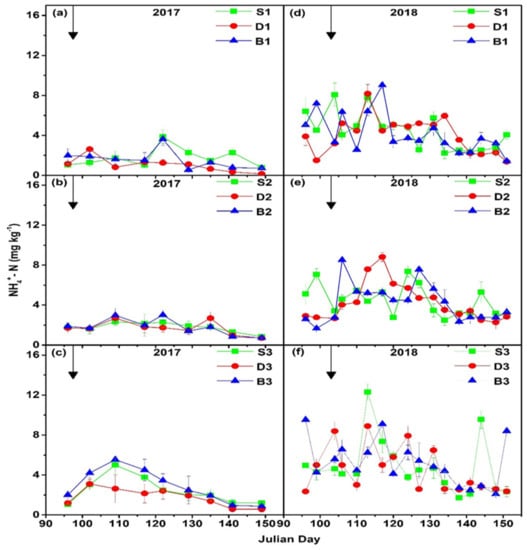 Soil ammonium nitrogen content (mg kg−1) in (a) 50% FC, (b) 60% FC, and (c) 70% FC irrigation scheduling during 2016–2017 and in (d) 50% FC, (e) 60% FC, and (f) 70% FC irrigation scheduling during 2017–2018 growing season at top 0–20 cm soil layer in all treatments. Note: S1, S2, and S3 represent sprinkler irrigation at 50%, 60%, and 70% FC, respectively. D1, D2, and D3 represent drip irrigation at 50%, 60%, and 70% FC, respectively. B1, B2, and B3 represent border irrigation at 50%, 60%, and 70% FC, respectively. Error bars represent standard errors of three replicates. The solid arrow indicates the day of fertilization.