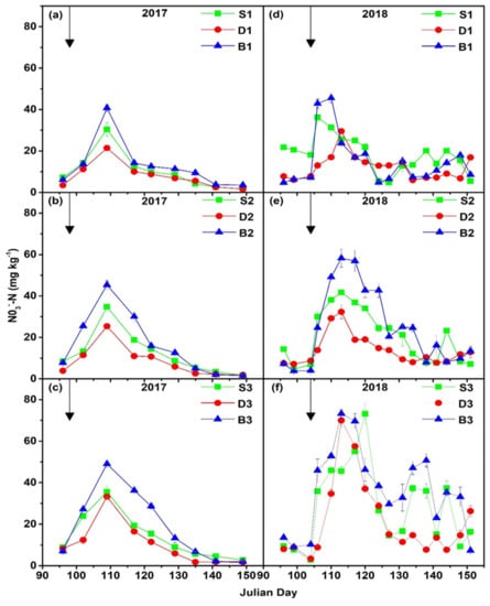 Soil nitrate nitrogen content (mg kg−1) in (a) 50% FC, (b) 60% FC, and (c) 70% FC irrigation scheduling during 2016–2017 and in (d) 50% FC, (e) 60% FC, and (f) 70% FC irrigation scheduling during 2017–2018 growing season at top 0–20 cm soil layer in all treatments. Note: S1, S2, and S3 represents sprinkler irrigation at 50%, 60%, and 70% FC, respectively. D1, D2, and D3 represents drip irrigation at 50%, 60%, and 70% FC, respectively. B1, B2, and B3 represents border irrigation at 50%, 60%, and 70% FC, respectively. Error bars represents standard errors of three replicates. The solid arrow indicates the day of fertilization.