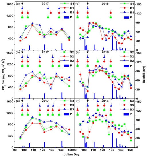 The seasonal CO2 emission flux (mg CO2 m−2 h−1) in (a) 50% FC, (b) 60% FC, and (c) 70% FC irrigation scheduling during 2016–2017 and in (d) 50% FC, (e) 60% FC, and (f) 70% FC irrigation scheduling during 2017–2018 growing season in all treatments. Note: S1, S2, and S3 represent sprinkler irrigation at 50%, 60%, and 70% FC, respectively. D1, D2, and D3 represent drip irrigation at 50%, 60%, and 70% FC, respectively. B1, B2, and B3 represent border irrigation at 50%, 60%, and 70% FC, respectively. P represents rainfall. Error bars represent standard errors of three replicates. Square, circular, and triangular arrows denote irrigation dates of sprinkler, drip, and border irrigation, respectively. The solid arrow indicates the day of fertilization.