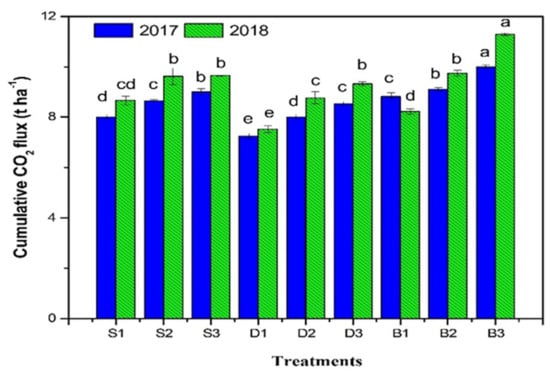 CO2 emissions were summed from Julian days 96–149 in 2017 and 96–151 in 2018 and are shown in Figure 7. The total cumulative CO2 amount varied from 7.2 ± 0.1 (D1) to 10.0 ± 0.1 (B3) t ha−1 in 2017 and from 7.5 ± 0.1 (D1) to 11.3 ± 0.1 (B3) t ha−1 in 2018. The cumulative CO2 amount pattern in 2017 and 2018 was border > sprinkler > drip irrigation at each irrigation level. Besides that, the cumulative CO2 amount pattern at 50% FC irrigation scheduling treatments was sprinkler > border > drip irrigation in 2018. The cumulative CO2 amount was significantly different in irrigation methods treatments at all water levels in 2017. In 2018, there were no significantly higher accumulated CO2 amounts measured in drip and sprinkler irrigation at the 70% FC irrigation scheduling treatments or in the sprinkler and border irrigation at the 50% FC and 60% FC irrigation scheduling levels. At 50% FC, the soil cumulative CO2 amount was lower by 7.0–15.3% and 12.6–19.4%, compared to 60% and 70% FC in 2017 and 2018, respectively. Border irrigation at a 70% FC irrigation scheduling level has a significantly higher accumulated CO2 amount.