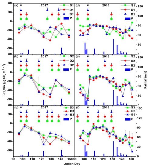 Seasonal CH4 uptake flux (µg CH4 m−2 h−1) in (a) 50% FC, (b) 60% FC, and (c) 70% FC irrigation scheduling during 2016–2017 and in (d) 50% FC, (e) 60% FC, and (f) 70% FC irrigation scheduling during the 2017–2018 growing season in all treatments. Note: S1, S2, and S3 represent sprinkler irrigation at 50%, 60%, and 70% FC, respectively. D1 D2, and D3 represent drip irrigation at 50%, 60%, and 70% FC, respectively. B1, B2, and B3 represent border irrigation at 50%, 60%, and 70% FC, respectively. P represents rainfall. Error bars represent standard errors of three replicates. Square, circular, and triangular arrows denote irrigation dates of sprinkler, drip, and border irrigation, respectively. The solid arrow indicates the day of fertilization.