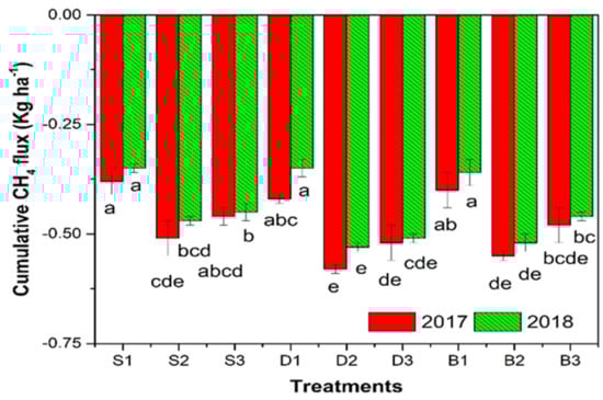 The cumulative CH4 amount (kg ha−1) for the 2016–2017 and 2017–2018 winter wheat growing seasons in all treatments. Error bars represent standard errors of three replicates. Different letters show significant differences (p < 0.05) between treatments.