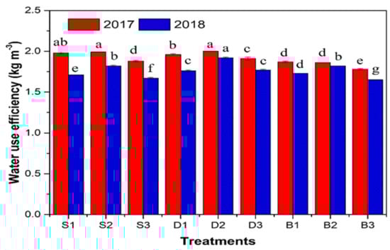At irrigation scheduling of 60% FC, drip irrigation produced a maximum WUE of 2.0 kg m−3 in 2017 and 1.9 kg m−3 in 2018 (Figure 10). However, at irrigation scheduling of 70% FC, border irrigation produced a minimum WUE of 1.8 kg m−3 in 2017 and 1.7 kg m−3 in 2018. Compared with border irrigation, drip and sprinkler irrigation have significantly higher WUE. In 2017, the overall WUE of lower irrigation scheduling (50% FC) was substantially higher compared with moderate (60% FC) and higher (70% FC) irrigation scheduling. In 2018, the WUE of 60% FC irrigation scheduling was substantially higher compared with 50% FC and 70% FC irrigation scheduling. Irrigation scheduling of 70% FC, compared with 50% FC and 60% FC irrigation scheduling, has a lower WUE of 2.0–4.2% and 5.0–9.2% in 2017 and 2018, respectively. In contrast, border irrigation compared with sprinkler and drip irrigation has a lower WUE of 0–5.6% and 4.6–6.1% in 2017 and 2018, respectively. The WUE of drip irrigation was significantly about 0.5–4.9% and 4.8–6.5% higher compared with sprinkler and border irrigation in 2017 and 2018, respectively. Moderate irrigation scheduling, compared with lower and higher irrigation scheduling, has a higher WUE 0.8–7.1% and 5.0–9.2% in 2017 and 2018, respectively. At a higher irrigation level, the photosynthetic rate of crops would not increase linearly; therefore, the transpiration rate consistently increased [40]. Thus, crops consumed more water at a higher irrigation level. As crop transpiration is considered the non-consumptive use of water for the crop [41]; therefore, higher irrigation caused a lower WUE. The WUE was substantially (p < 0.05) affected by irrigation methods, irrigation scheduling, and the interaction between them.