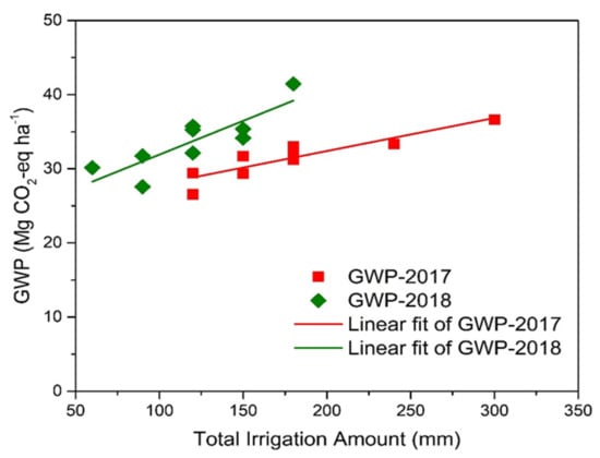 The relationship between global warming potential GWP (Mg CO2-eq ha−1) and the total irrigation amount (mm) for the 2016–2017 and 2017–2018 winter wheat seasons.