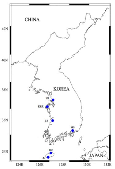 Map of the sampling stations of Oxyrrhis marina (Shiwha [SH], Karorim [KRR], Gunsan [GS], Masan [MS], Korea) and O. maritima (Jeju-Anduck [JJ] and Hamduck [HD], which are located in Jeju Island, Korea).