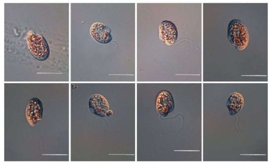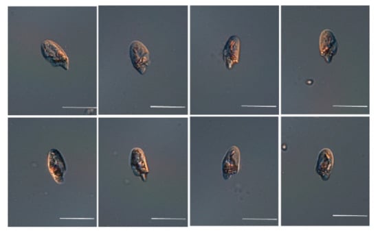 Micrographs of Oxyrrhis marina (OMGS 0105) using light microscopy. Scale bars = 20 µm.
