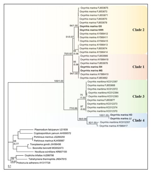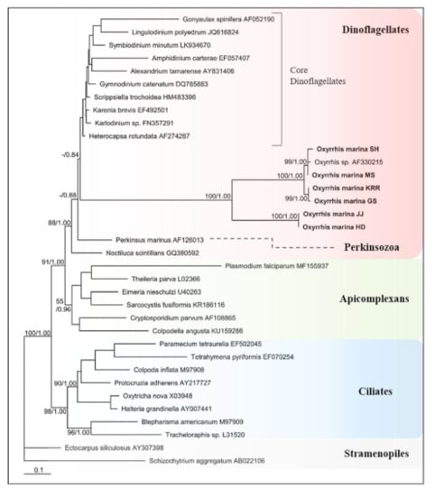 The phylogenetic positions of O. marina are great of importance for understanding cell biology and evolutionary diversity. In particular, the relationships between the Apicomplexa and dinoflagellates have a great impact on disease-causing Apicomplexans and fundamental diversity in eukaryotic cell biology []. The dinoflagellate lineage includes abstruse organisms such as syndinians, noctilucoids, Pavilucifera, Perkinsus, and Oxyrrhis. These protists are highly related to Oxyrrhis and their phylogenetic positions are still a matter of debate []. Thus, our study conducted the phylogenetic analysis of Oxyrrhis using nuclear SSU rDNA with P. marinus, Noctiluca scintillans, the Apicomplexa (Colphodella), and Ciliates. The relationship with Amoebophrya spp. (Syndinians) was also considered (not shown data), but it was excluded since the sequence length was too long to align with others.
