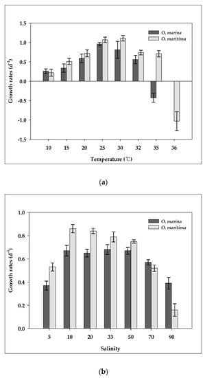 Environmental conditions are an important factor in determining the growth of O. marina and O. maritima. O. marina did not grow at water temperatures ≥ 35 °C, whereas O. maritima did. Thus, the highest temperature for positive growth of O. marina is likely to be approximately 32 °C, whereas that for O. maritima is ≥32 °C. O. marina did not grow at salinities below 4, and as salinity increased from 5 to 50, the growth rate increased continuously but rapidly decreased when salinity was over 70. However, O. maritima could grow at a salinity of 2, and its growth rate increased as salinity increased from 3 to 50, and rapidly decreased as salinity increased over 70. Thus, O. marina and O. maritima may have different ecophysiology, reflecting their habitats; O. maritima inhabits areas of higher salinity and temperatures (tidal pools) than O. marina (water columns).