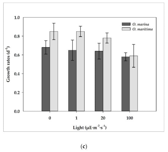 At the light intensities of 0–100 μE·m−2·s−1, the growth rates of dried yeast-fed O. marina did not largely change (i.e., 0.58 d−1 at 0 μE·m−2·s−1 to 0.59 d−1 at 100 μE·m−2·s−1). However, with increasing light intensity from 0 to 100 μE·m−2·s−1, the growth rate of O. maritima decreased from 0.85 d−1 at 0 μE·m−2·s−1 to 0.59 d−1 at 100 μE·m−2·s−1 (Figure 6c). The growth rates of O. marina and O. maritima were not affected by the light intensity (ANOVA test, p > 0.1, Figure 6c). In addition, the growth rate of O. marina was not significantly different from that of O. maritima (p > 0.1, two-tailed t-test).