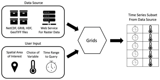 The Grids package implements these steps in a software architecture diagrammed in Figure 1. The Grids package code accepts a data source and user inputs and returns the extracted time series in a tabular structure. In steps one and eight, Grids interacts with the data source, which is the unique file format used for the data. In steps two through six, Grids uses inputs from the user, such as variable names, spatial locations, and time ranges, to extract a subset of data from the files. In step seven, Grids outputs the time series in the tabular Pandas DataFrame structure and returns this object for the user to process, save, or reformat as necessary [30]. As shown in Figure 1, the eight-step process for extracting a subset of time series data from a gridded dataset simplifies to the data source, user provided inputs, a tool which executes the querying for the data source, and an output.