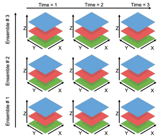 This procedure using coordinates scales to data of other dimensional sizes if the number of dimensions of the array is equal to the number of specified coordinates. The dimensions in datasets of more than three dimensions no longer correspond to an independent spatial dimension but can be traversed in the same fashion. Figure 3 presents a five-dimensional data set, ℝ5, which is a 3D spatial volume with three different realizations along the ensemble number dimension and three across the time dimension. In this instance, Grids uses the coordinates provided by the user to determine the proper subset in five dimensions in the same manner as was described with previous examples. The coordinate provided by the user is compared to the coordinate variable values stored in the file to identify the correct subset of the variable’s array. Those values are read from the multidimensional data file, formatted, and returned to the user.