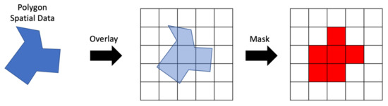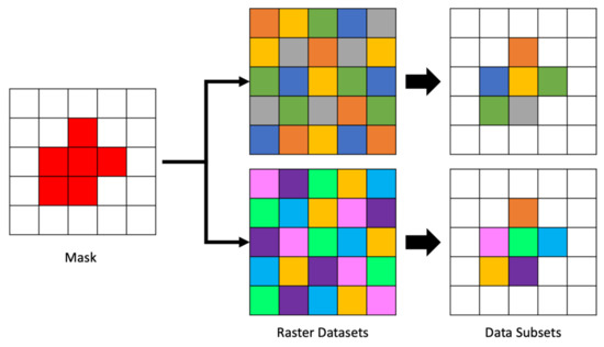An example of the steps to create a raster mask for spatial data are shown in Figure 4 assuming a vector representation of the spatial area of interest and 2D spatial gridded data. The vector area is overlain on a blank array of the same shape and resolution as the data to be masked. Cells in the mask raster on the right were selected using a geoprocessing algorithm to compare the amount of area in each cell covered by the vector polygon. Cells covered more than 50% by the polygon were selected. The mask contains the values 0 or 1, shown as white and red, respectively in Figure 4. Where the mask has a 1, we retrieve the data, where it has a 0, we do not.