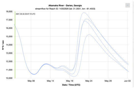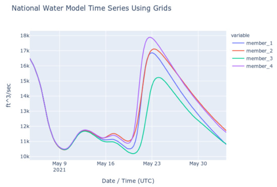 To check the accuracy of the results retrieved using Grids, we retrieved series from downloaded copies of the NWM multidimensional dataset (NetCDF) and compared them to results retrieved using the authoritative NWM web app [41]. The time series shown in the following plots show the NWM long term forecast generated 4 May 2021 06:00 UTC for the outlet of the Altamaha River in Darien, Georgia, United States. This forecast is for the following 30 days and is comprised of 4 ensemble members. Each member is plotted separately. Figure 6 shows the time series retrieved from the web app for the NWM provided by NOAA and Figure 7 shows the time series generated with downloaded copies of the NWM data and extracted using Grids (plots generated with Plotly) [42]. These figures show that the results from the authoritative web app for the NWM are identical to those retrieved using Grids.