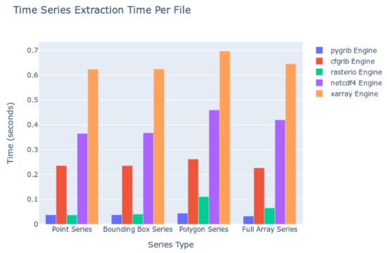We interpreted these data by comparing the file reading engine with the file formats supported (Table 2). These data indicate that for our test, the Pygrib engine, which supports reading only GRIB data, is the fastest, with an averaged time of less than 0.1 second per file in the series. The Rasterio engine, which reads GeoTIFF data, follows closely behind. The Cfgrib engine is next with average read times between 0.2 and 0.3 s. NetCDF and HDF data, as read by the NetCDF4 engine, come next with times ranging between 0.35 and 0.5 s, respectively. The slowest engine is the Xarray engine with read times of 0.6 s.